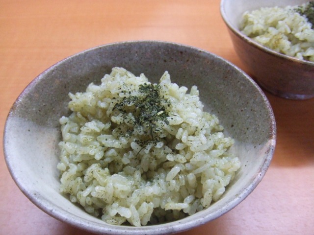 材料(4人分) 米・・・・・・・・・2カップ 抹茶・・・・・・・大匙1/2 塩・・・・・・・・・小匙1 煎茶の葉っぱ・・・・・少々作り方 1.米はといでざるにあげておく。 2.抹茶を同量の水で溶き、炊飯器に米と分量の水と 一緒に加えてよく混ぜる。塩を加えて炊く。 3.煎茶の葉はフライパンで炒ってすり鉢でする。 4.2のご飯を器に盛り3の茶の葉を載せる。